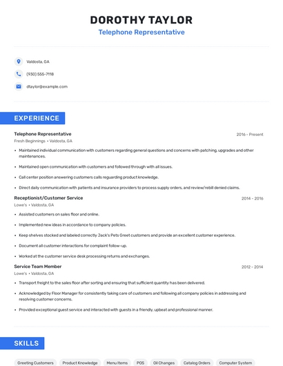 Build a professional telephone representative resume in minutes. Browse through our resume examples to identify the best way to word your resume. Then choose from 5+ resume templates to create your telephone representative resume.