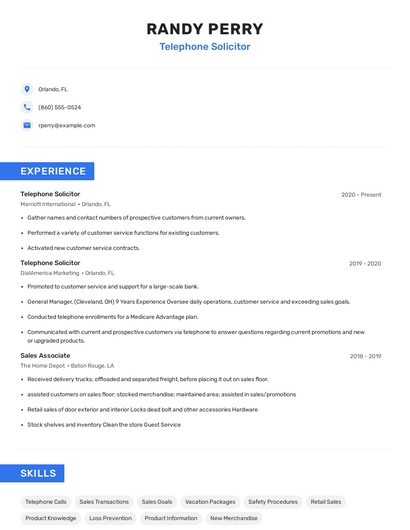 Build a professional telephone solicitor resume in minutes. Our AI resume writing assistant will guide you through every step of the process, and you can choose from 10+ resume templates to create your telephone solicitor resume.7. Private Individuals