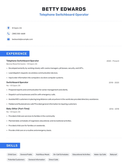 Build a professional telephone switchboard operator resume in minutes. Our AI resume writing assistant will guide you through every step of the process, and you can choose from 10+ resume templates to create your telephone switchboard operator resume.7. Two-Way Radio