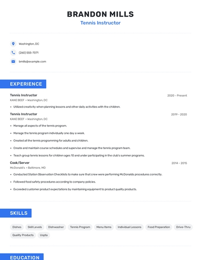 Build a professional tennis instructor resume in minutes. Browse through our resume examples to identify the best way to word your resume. Then choose from 5+ resume templates to create your tennis instructor resume.