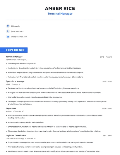Build a professional terminal manager resume in minutes. Browse through our resume examples to identify the best way to word your resume. Then choose from 5+ resume templates to create your terminal manager resume.