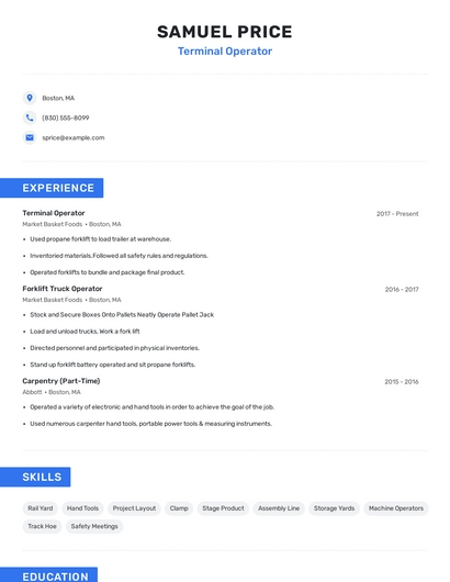 Build a professional terminal operator resume in minutes. Browse through our resume examples to identify the best way to word your resume. Then choose from 5+ resume templates to create your terminal operator resume.