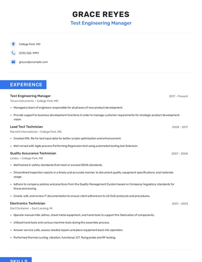 Build a professional test engineering manager resume in minutes. Browse through our resume examples to identify the best way to word your resume. Then choose from 5+ resume templates to create your test engineering manager resume.