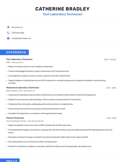 Build a professional test laboratory technician resume in minutes. Browse through our resume examples to identify the best way to word your resume. Then choose from 5+ resume templates to create your test laboratory technician resume.