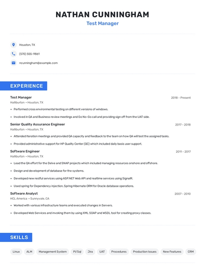 Build a professional test manager resume in minutes. Browse through our resume examples to identify the best way to word your resume. Then choose from 5+ resume templates to create your test manager resume.