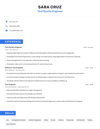 Build a professional test/quality engineer resume in minutes. Browse through our resume examples to identify the best way to word your resume. Then choose from 5+ resume templates to create your test/quality engineer resume.