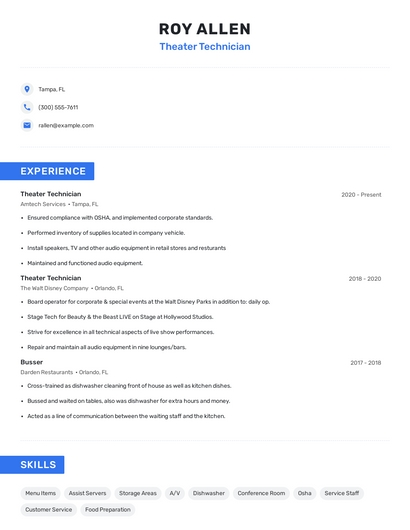 Build a professional theater technician resume in minutes. Browse through our resume examples to identify the best way to word your resume. Then choose from 5+ resume templates to create your theater technician resume.
