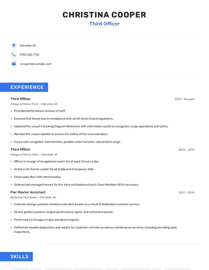 Build a professional third officer resume in minutes. Our AI resume writing assistant will guide you through every step of the process, and you can choose from 10+ resume templates to create your third officer resume.7. Coast Guard