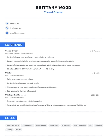 The most important skills for a thread grinder resume and required skills for a thread grinder to have include: