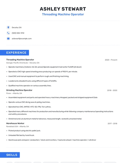 Build a professional threading machine operator resume in minutes. Our AI resume writing assistant will guide you through every step of the process, and you can choose from 10+ resume templates to create your threading machine operator resume.7. Assembly Line