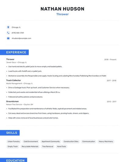 Build a professional thrower resume in minutes. Our AI resume writing assistant will guide you through every step of the process, and you can choose from 10+ resume templates to create your thrower resume.7. CDL