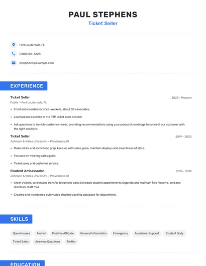 Build a professional ticket seller resume in minutes. Browse through our resume examples to identify the best way to word your resume. Then choose from 5+ resume templates to create your ticket seller resume.