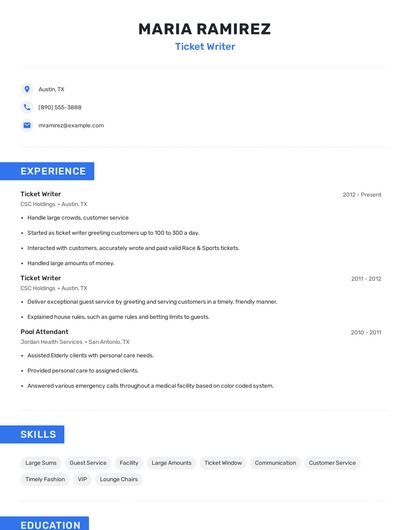 Build a professional ticket writer resume in minutes. Our AI resume writing assistant will guide you through every step of the process, and you can choose from 10+ resume templates to create your ticket writer resume.7. Cash Drawers