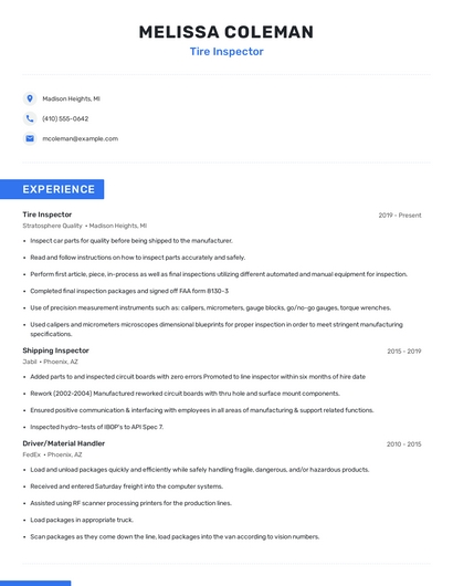 Build a professional tire inspector resume in minutes. Our AI resume writing assistant will guide you through every step of the process, and you can choose from 10+ resume templates to create your tire inspector resume.7. Measure Materials