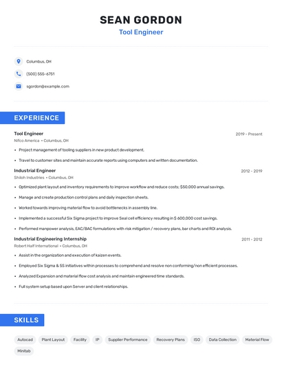 Build a professional tool engineer resume in minutes. Browse through our resume examples to identify the best way to word your resume. Then choose from 5+ resume templates to create your tool engineer resume.