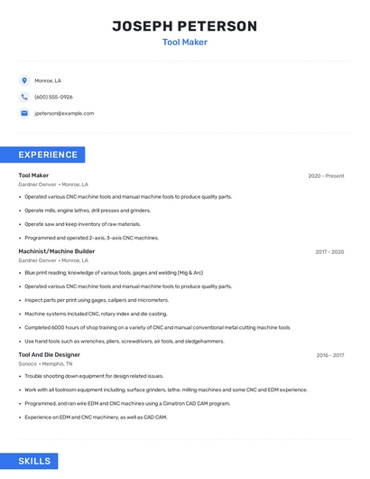 Build a professional tool maker resume in minutes. Browse through our resume examples to identify the best way to word your resume. Then choose from 5+ resume templates to create your tool maker resume.