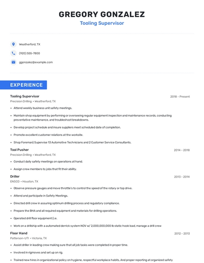 Build a professional tooling supervisor resume in minutes. Browse through our resume examples to identify the best way to word your resume. Then choose from 5+ resume templates to create your tooling supervisor resume.