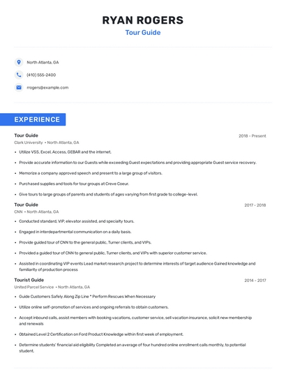 Build a professional tour guide resume in minutes. Browse through our resume examples to identify the best way to word your resume. Then choose from 5+ resume templates to create your tour guide resume.