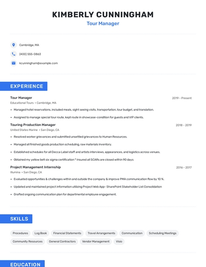 Build a professional tour manager resume in minutes. Browse through our resume examples to identify the best way to word your resume. Then choose from 5+ resume templates to create your tour manager resume.