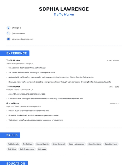 Build a professional traffic worker resume in minutes. Our AI resume writing assistant will guide you through every step of the process, and you can choose from 10+ resume templates to create your traffic worker resume.What skills help Traffic Workers find jobs?