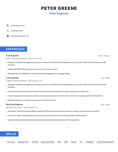 Build a professional train engineer resume in minutes. Browse through our resume examples to identify the best way to word your resume. Then choose from 5+ resume templates to create your train engineer resume.