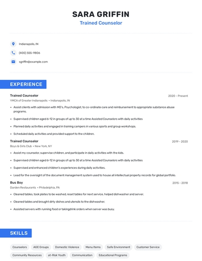 Build a professional trained counselor resume in minutes. Browse through our resume examples to identify the best way to word your resume. Then choose from 5+ resume templates to create your trained counselor resume.