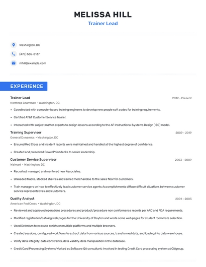 Build a professional trainer lead resume in minutes. Browse through our resume examples to identify the best way to word your resume. Then choose from 5+ resume templates to create your trainer lead resume.