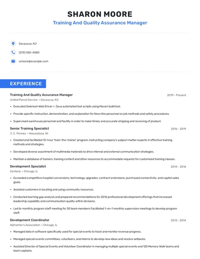 Build a professional training and quality assurance manager resume in minutes. Browse through our resume examples to identify the best way to word your resume. Then choose from 5+ resume templates to create your training and quality assurance manager resume.