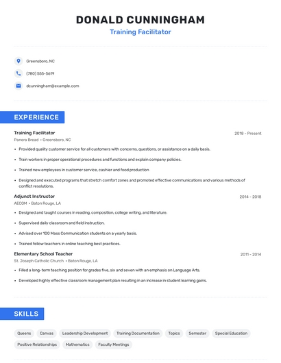 Build a professional training facilitator resume in minutes. Browse through our resume examples to identify the best way to word your resume. Then choose from 5+ resume templates to create your training facilitator resume.