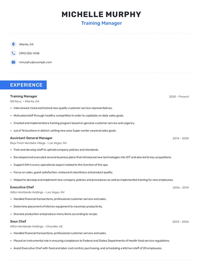Build a professional training manager resume in minutes. Browse through our resume examples to identify the best way to word your resume. Then choose from 5+ resume templates to create your training manager resume.