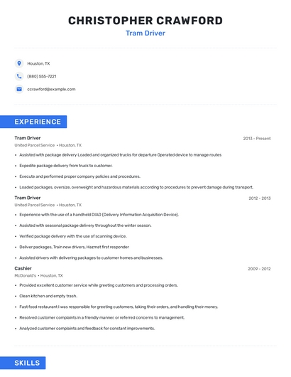Build a professional tram driver resume in minutes. Browse through our resume examples to identify the best way to word your resume. Then choose from 5+ resume templates to create your tram driver resume.