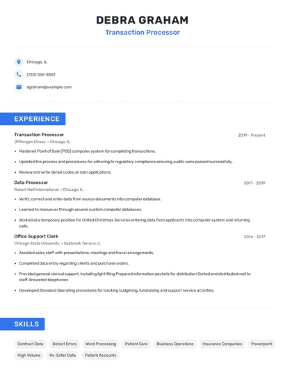 Build a professional transaction processor resume in minutes. Browse through our resume examples to identify the best way to word your resume. Then choose from 5+ resume templates to create your transaction processor resume.