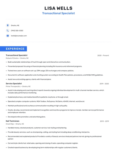 Choose from 10+ customizable transactional specialist resume templates