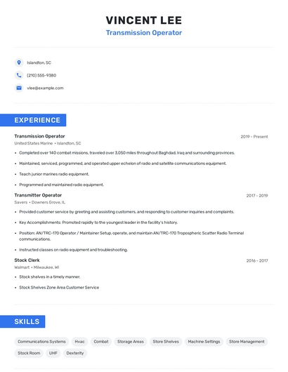 Build a professional transmission operator resume in minutes. Our AI resume writing assistant will guide you through every step of the process, and you can choose from 10+ resume templates to create your transmission operator resume.7. Combat