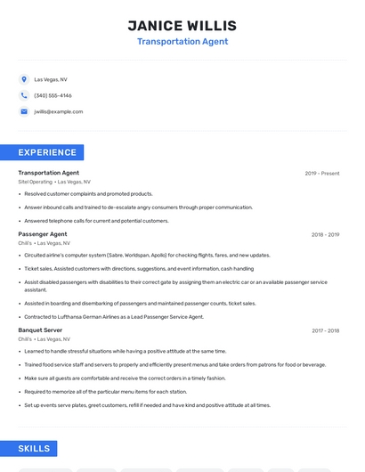 Build a professional transportation agent resume in minutes. Our AI resume writing assistant will guide you through every step of the process, and you can choose from 10+ resume templates to create your transportation agent resume.7. Transportation Services