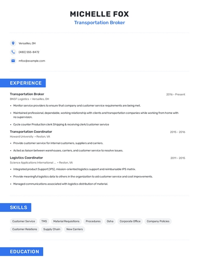 Build a professional transportation broker resume in minutes. Browse through our resume examples to identify the best way to word your resume. Then choose from 5+ resume templates to create your transportation broker resume.