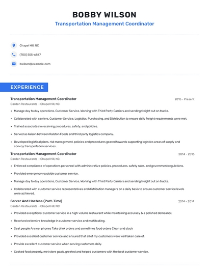Build a professional transportation management coordinator resume in minutes. Browse through our resume examples to identify the best way to word your resume. Then choose from 5+ resume templates to create your transportation management coordinator resume.