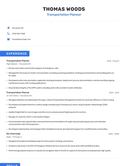 Build a professional transportation planner resume in minutes. Browse through our resume examples to identify the best way to word your resume. Then choose from 5+ resume templates to create your transportation planner resume.