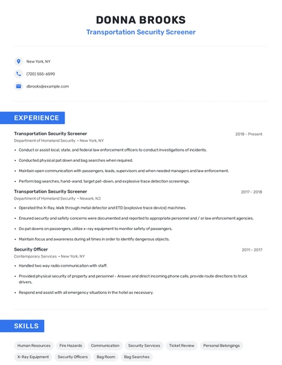 Build a professional transportation security screener resume in minutes. Browse through our resume examples to identify the best way to word your resume. Then choose from 5+ resume templates to create your transportation security screener resume.