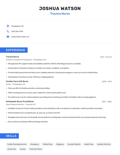 Build a professional trauma nurse resume in minutes. Browse through our resume examples to identify the best way to word your resume. Then choose from 5+ resume templates to create your trauma nurse resume.
