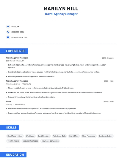 Build a professional travel agency manager resume in minutes. Browse through our resume examples to identify the best way to word your resume. Then choose from 5+ resume templates to create your travel agency manager resume.