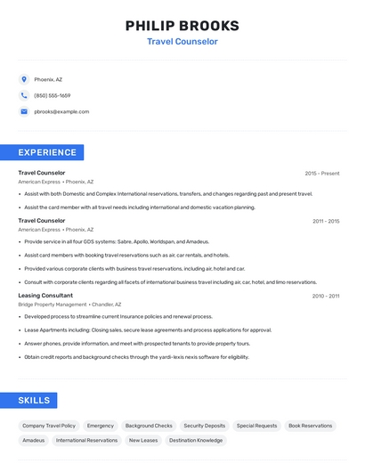 Build a professional travel counselor resume in minutes. Browse through our resume examples to identify the best way to word your resume. Then choose from 5+ resume templates to create your travel counselor resume.