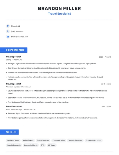 Build a professional travel specialist resume in minutes. Browse through our resume examples to identify the best way to word your resume. Then choose from 5+ resume templates to create your travel specialist resume.