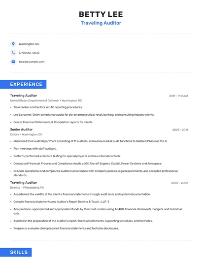 Build a professional traveling auditor resume in minutes. Our AI resume writing assistant will guide you through every step of the process, and you can choose from 10+ resume templates to create your traveling auditor resume.What skills help Traveling Auditors find jobs?