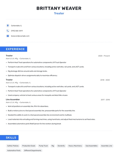 Build a professional treater resume in minutes. Our AI resume writing assistant will guide you through every step of the process, and you can choose from 10+ resume templates to create your treater resume.7. Utility Poles