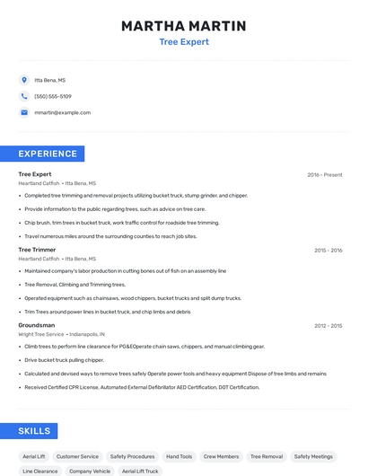 Build a professional tree expert resume in minutes. Browse through our resume examples to identify the best way to word your resume. Then choose from 5+ resume templates to create your tree expert resume.