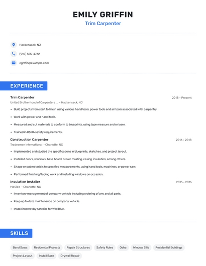Build a professional trim carpenter resume in minutes. Browse through our resume examples to identify the best way to word your resume. Then choose from 5+ resume templates to create your trim carpenter resume.
