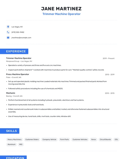 Build a professional trimmer machine operator resume in minutes. Our AI resume writing assistant will guide you through every step of the process, and you can choose from 10+ resume templates to create your trimmer machine operator resume.What skills help Trimmer Machine Operators find jobs?