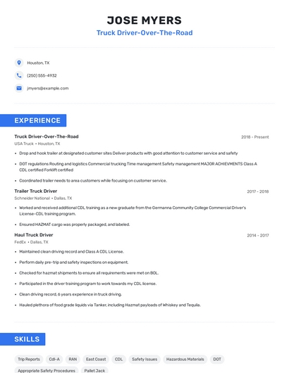 Build a professional truck driver-over-the-road resume in minutes. Browse through our resume examples to identify the best way to word your resume. Then choose from 5+ resume templates to create your truck driver-over-the-road resume.