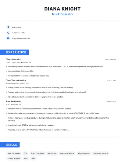 Build a professional truck operator resume in minutes. Browse through our resume examples to identify the best way to word your resume. Then choose from 5+ resume templates to create your truck operator resume.